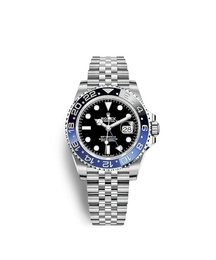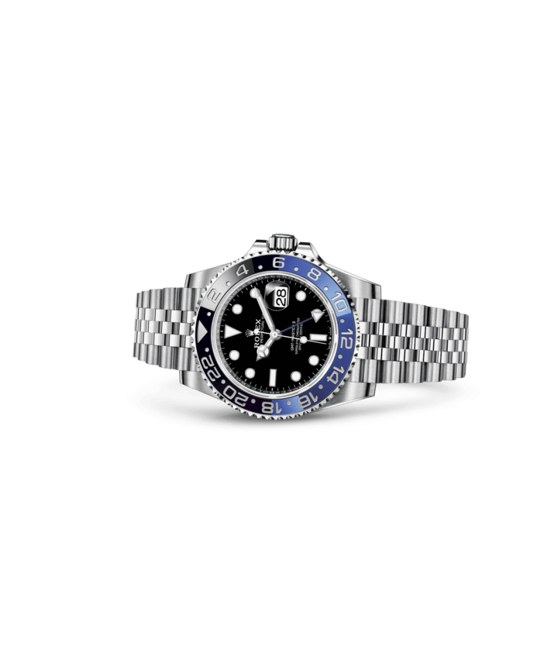 すべてのロレックス プロフェッショナルウォッチと同様に、GMTマスターⅡはクロマライト ディスプレイにより、どのような状況、特に暗闇の中で優れた視認性を誇る。幅広の針と三角形、円形、長方形といったシンプルな形のアワーマーカーには、ブルーの光を放つ長時間継続の発光素材が採用されている。
