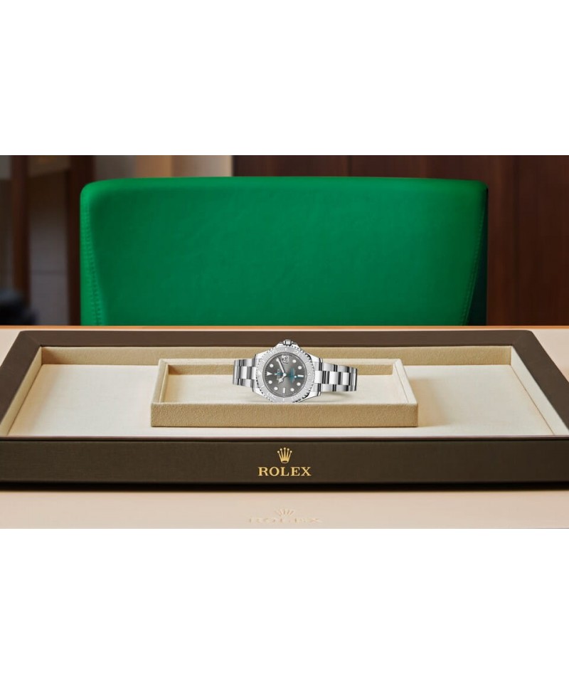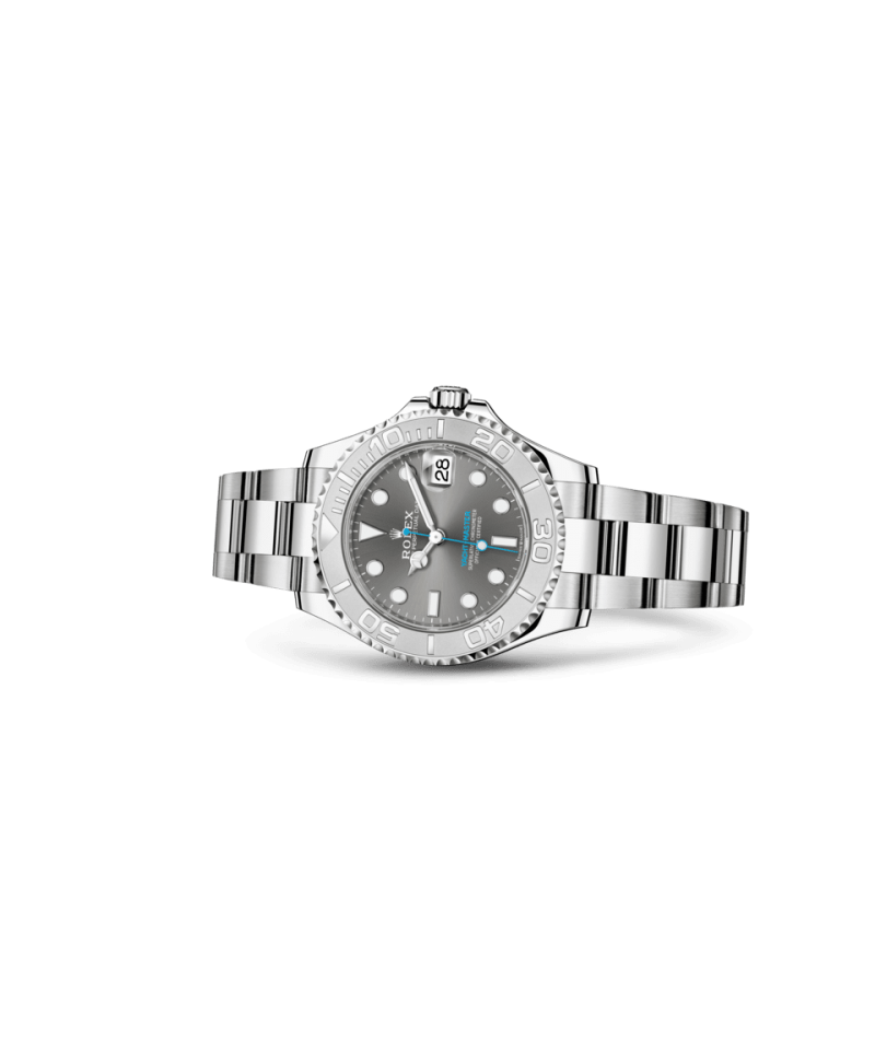 すべてのロレックス プロフェッショナルウォッチと同様に、ヨットマスター 37はクロマライト ディスプレイにより、どのような状況でも特に暗闇の中で優れた視認性を誇る。幅広の針と三角形、円形、長方形といったシンプルな形のアワーマーカーには、ブルーの光を放つ長時間継続の発光素材が採用されている。