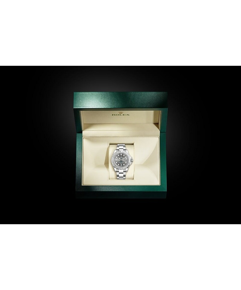 ヨットマスターの60分目盛り入り両方向回転ベゼルには希少な素材が使用されている。サンドブラスト仕上げのマット地に、レイズド仕上げの数字と目盛りが際立つ。