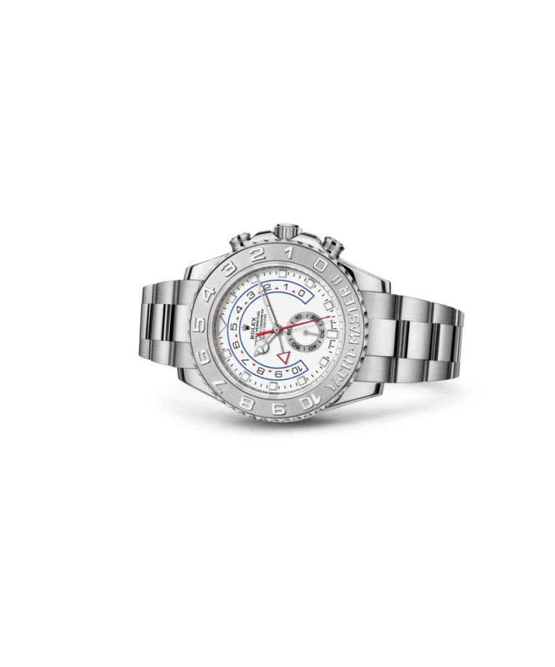 ヨットマスターⅡは、ロレックスのプロフェッショナルモデルの特徴である新しい針が採用された新ダイアルを搭載。視認性が向上し、デザインの美しさが際立つ。新しいダイアルのアワーマーカーは12 時位置が三角形、6 時位置が長方形で、より直感的に時刻を読み取ることができる。時針の先端は発光性のディスク型になり、分針とはっきり区別することが可能だ。ヨットマスターⅡは 1 分〜 10分までのカウントダウンをプログラムできる機能が搭載されている。プログラミングは機械に記憶されるため、リセットすると前回の設定に戻る。レース開始後は、公式カウントダウンに合わせ、瞬時に同期させることができる。