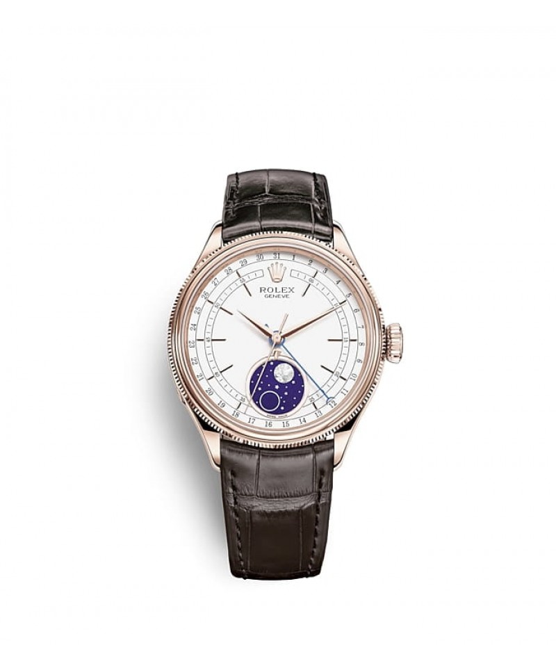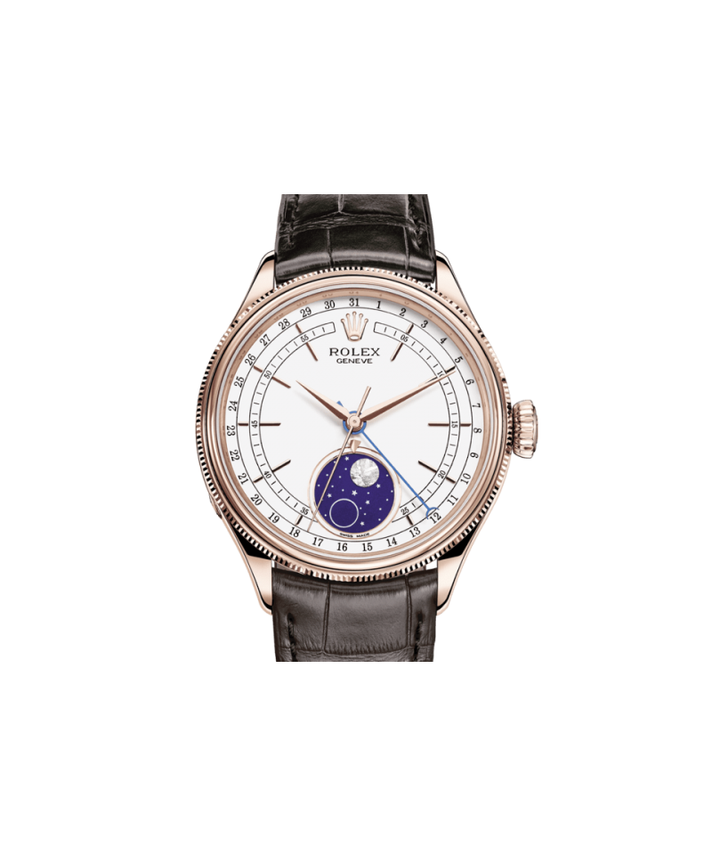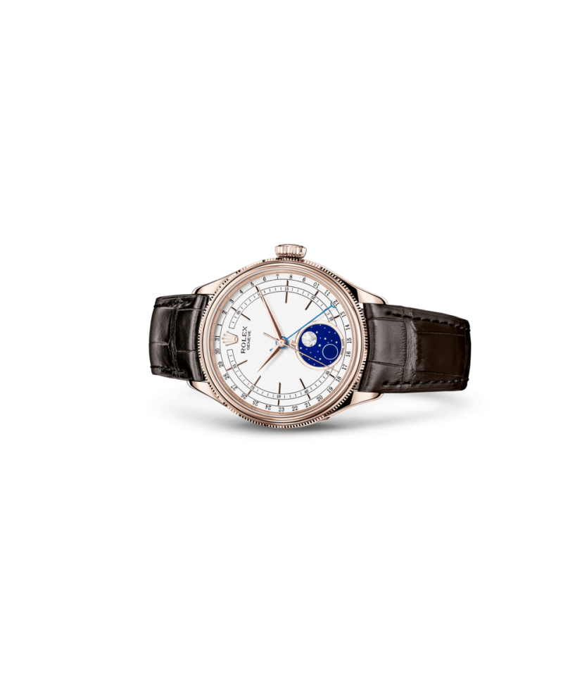 チェリーニ ムーンフェイズのホワイトラッカーダイアルには、6 時位置にブルーのエナメル ディスクが配され、満月と新月を表示します。満月はメテオライトのアップリケ、新月はシルバーカラーのリングで表されます。