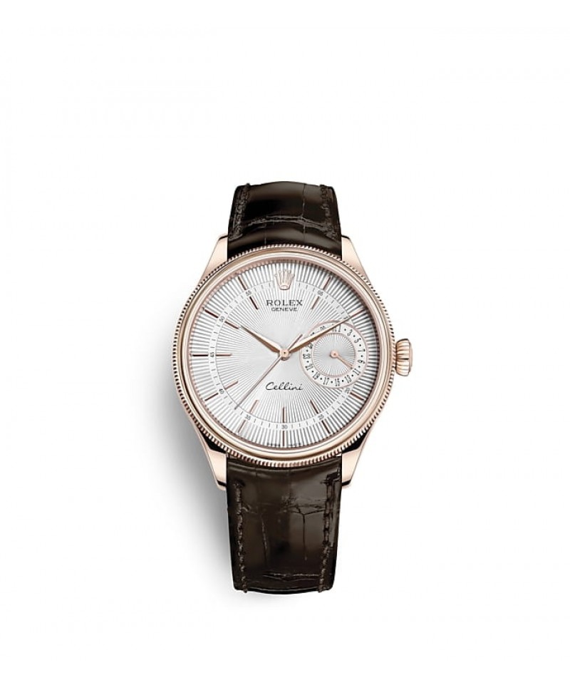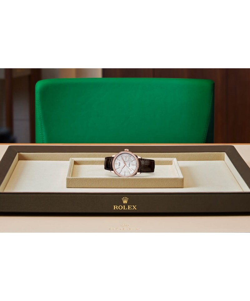 円型でクラシックな39 mm径と18 ct ゴールドの特別なケースが伝統の証であるとともに、チェリーニの洗練されたラグやポリッシュ仕上げ、ダブルベゼル(ひとつはドーム、もう一方はフルーテッド)が個性をもたらす。スクリュー式裏蓋はかつてのモデルを彷彿させるドーム型であり、確かな信頼性を際立たせる。