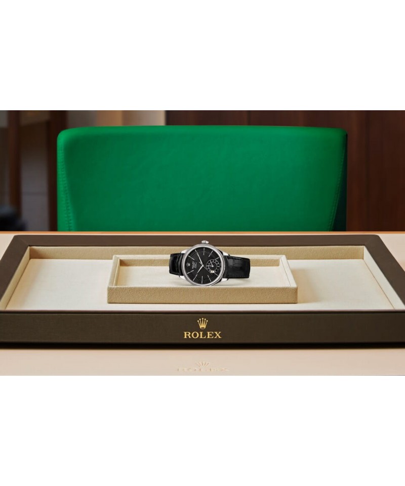 円型でクラシックな39 mm径と18 ct ゴールドの特別なケースが伝統の証であるとともに、チェリーニの洗練されたラグやポリッシュ仕上げ、ダブルベゼル(ひとつはドーム、もう一方はフルーテッド)が個性をもたらす。スクリュー式裏蓋はかつてのモデルを彷彿させるドーム型であり、確かな信頼性を際立たせる。